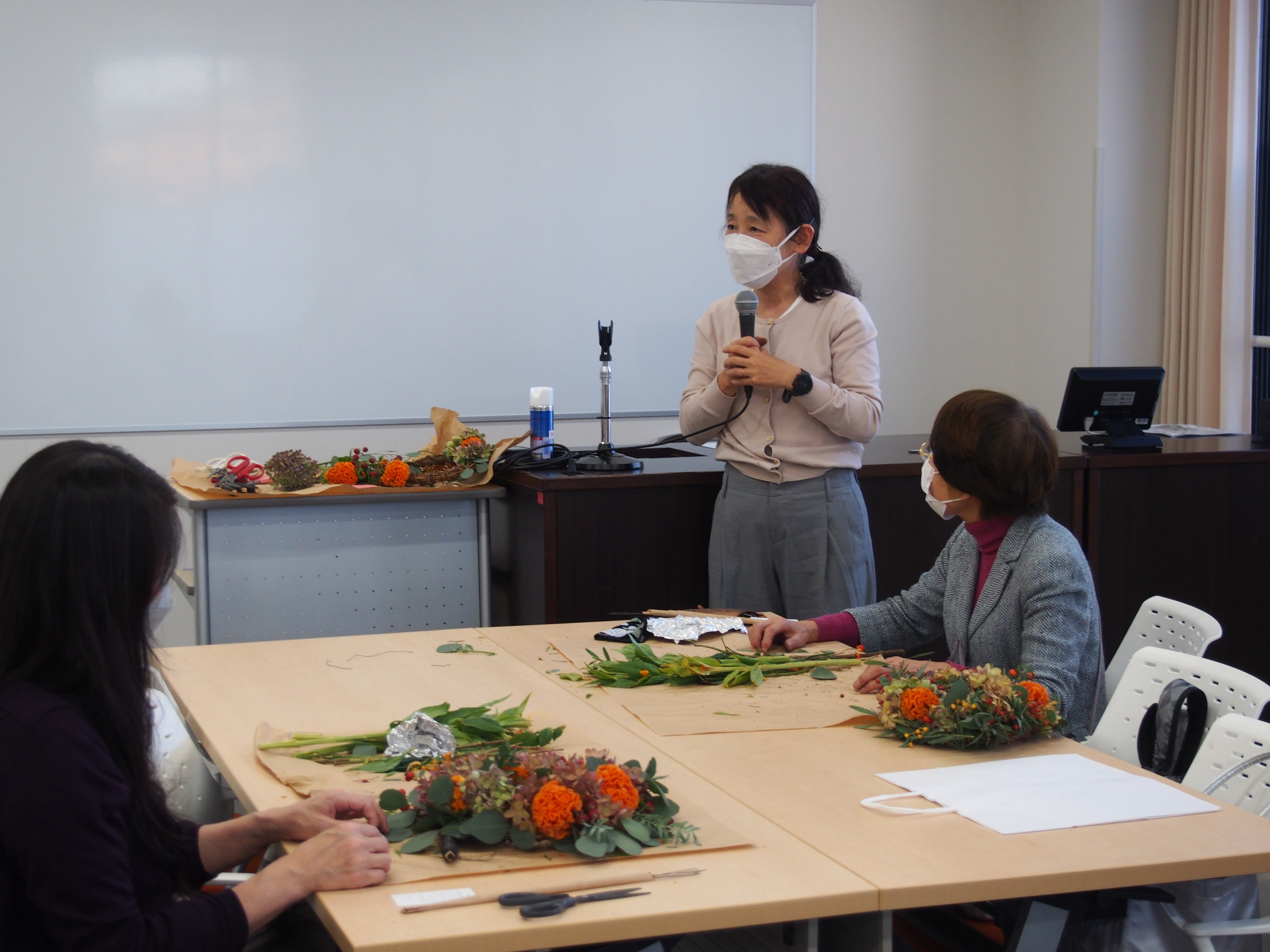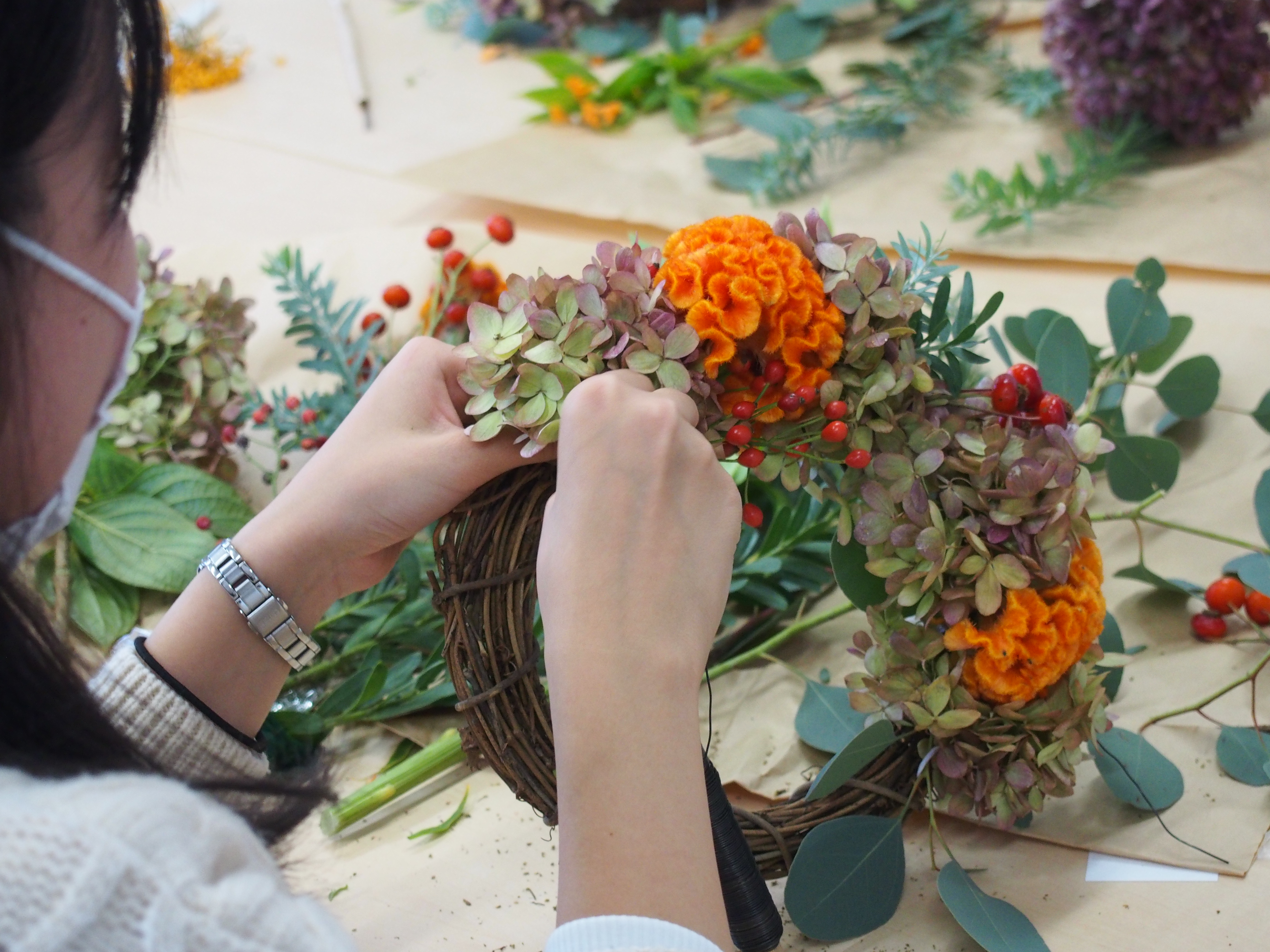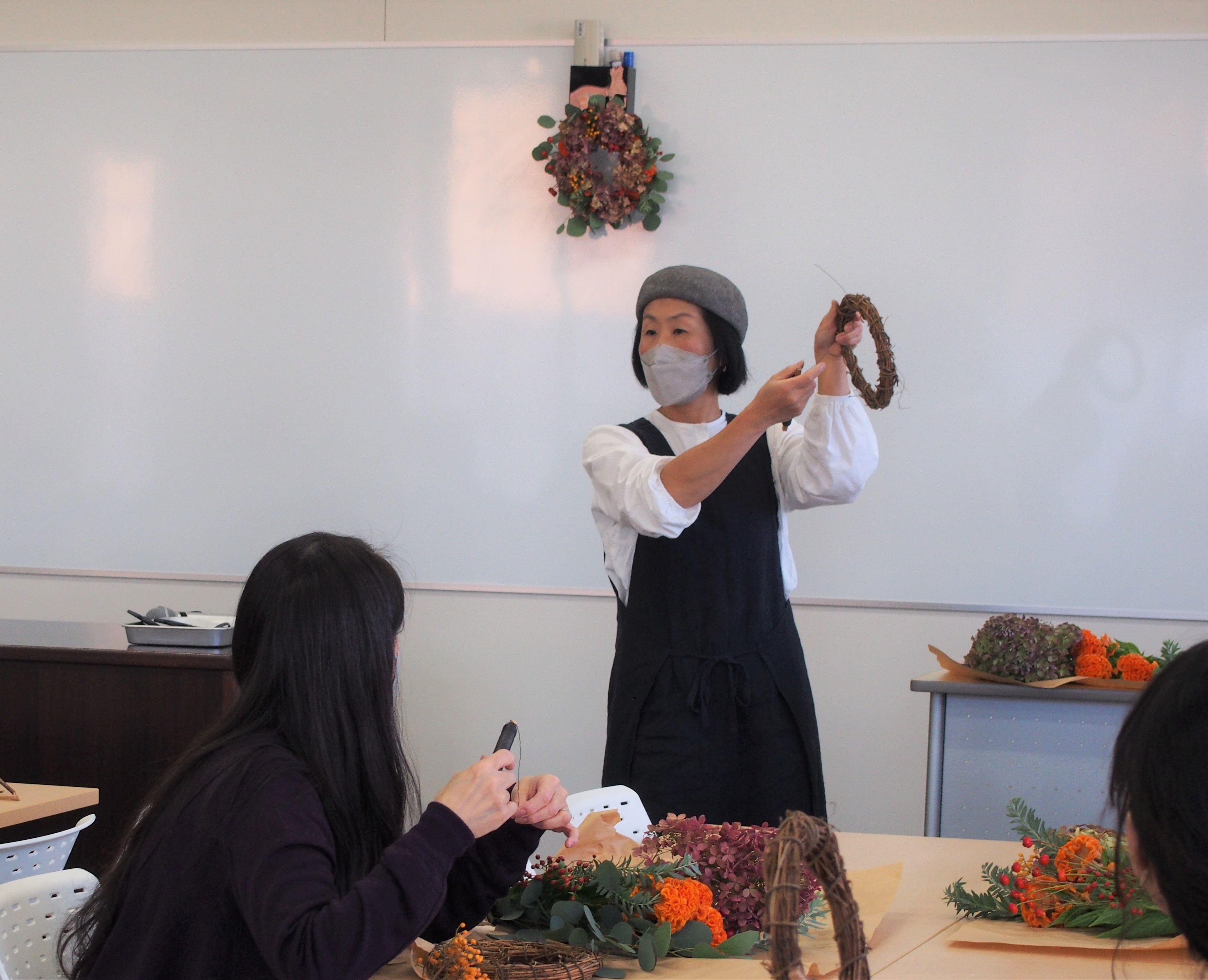 多くの参加者がリース作りは今回が初めてということで、上手に作れるか不安げな表情でしたが、講師の花屋suuka 秋田さんが丁寧に作り方を教えてくださり、また、参加者同士が励まし合って、とても楽しく和やかな雰囲気でリースを作り終えることができました。