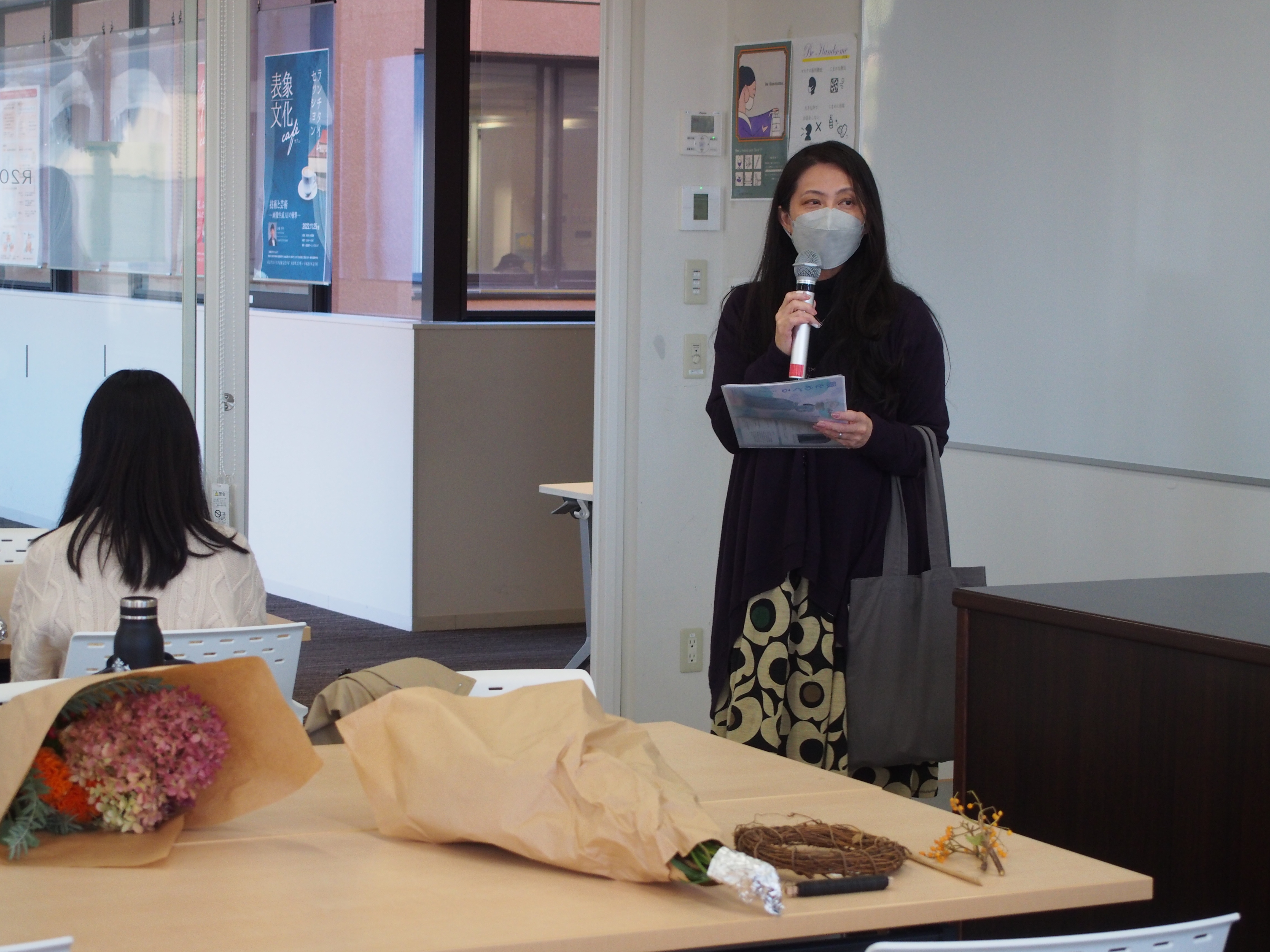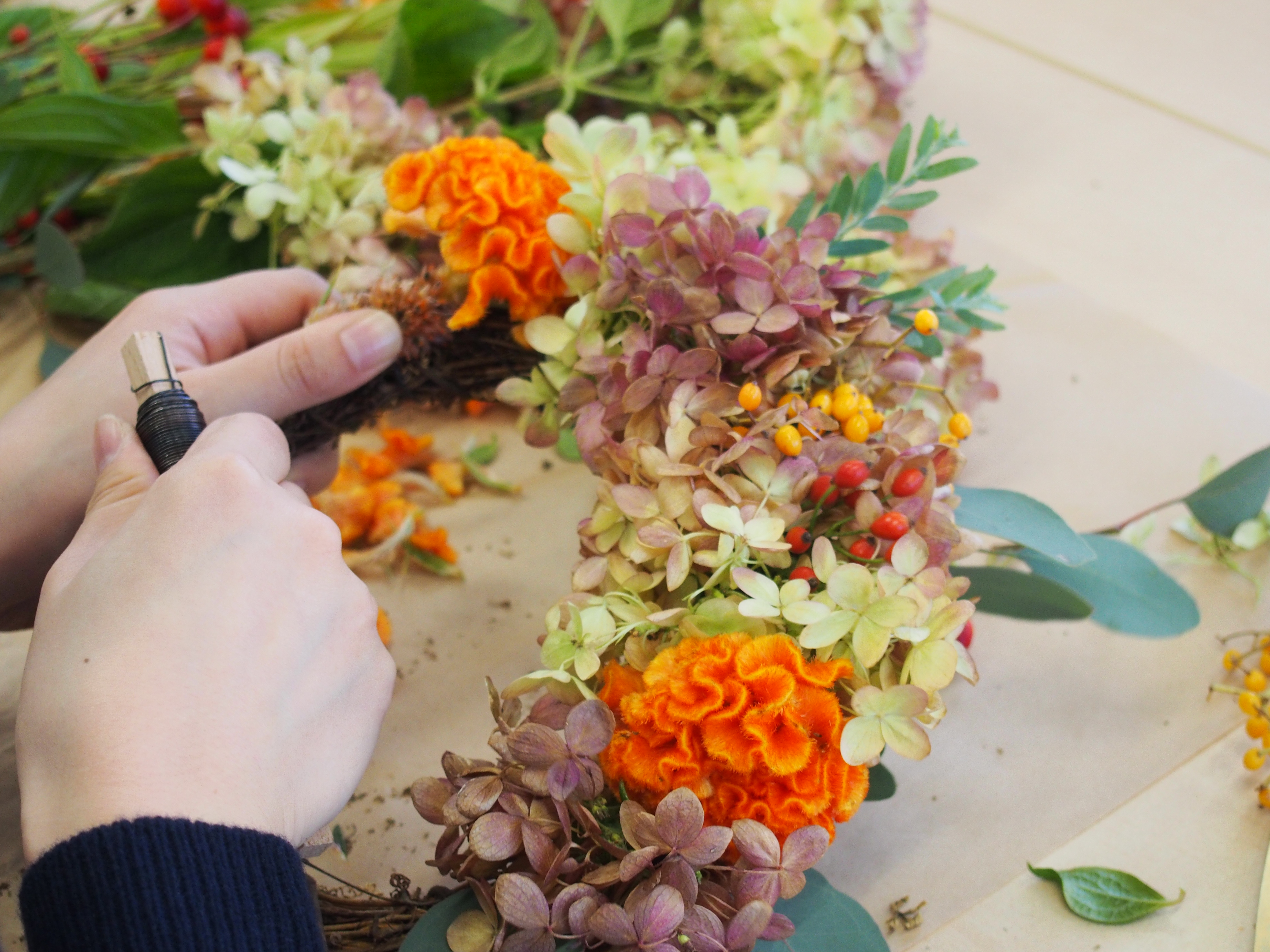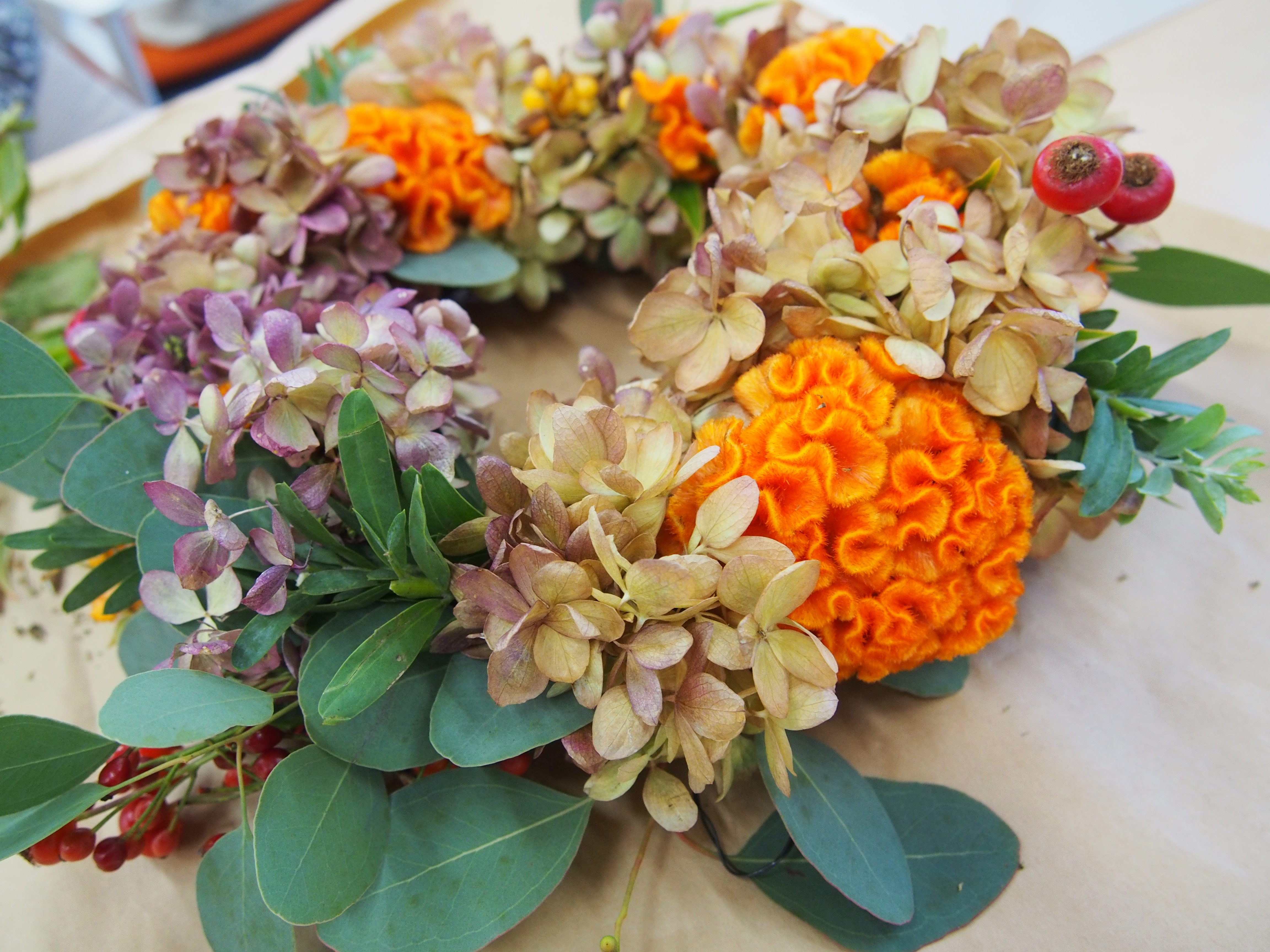 多くの参加者がリース作りは今回が初めてということで、上手に作れるか不安げな表情でしたが、講師の花屋suuka 秋田さんが丁寧に作り方を教えてくださり、また、参加者同士が励まし合って、とても楽しく和やかな雰囲気でリースを作り終えることができました。