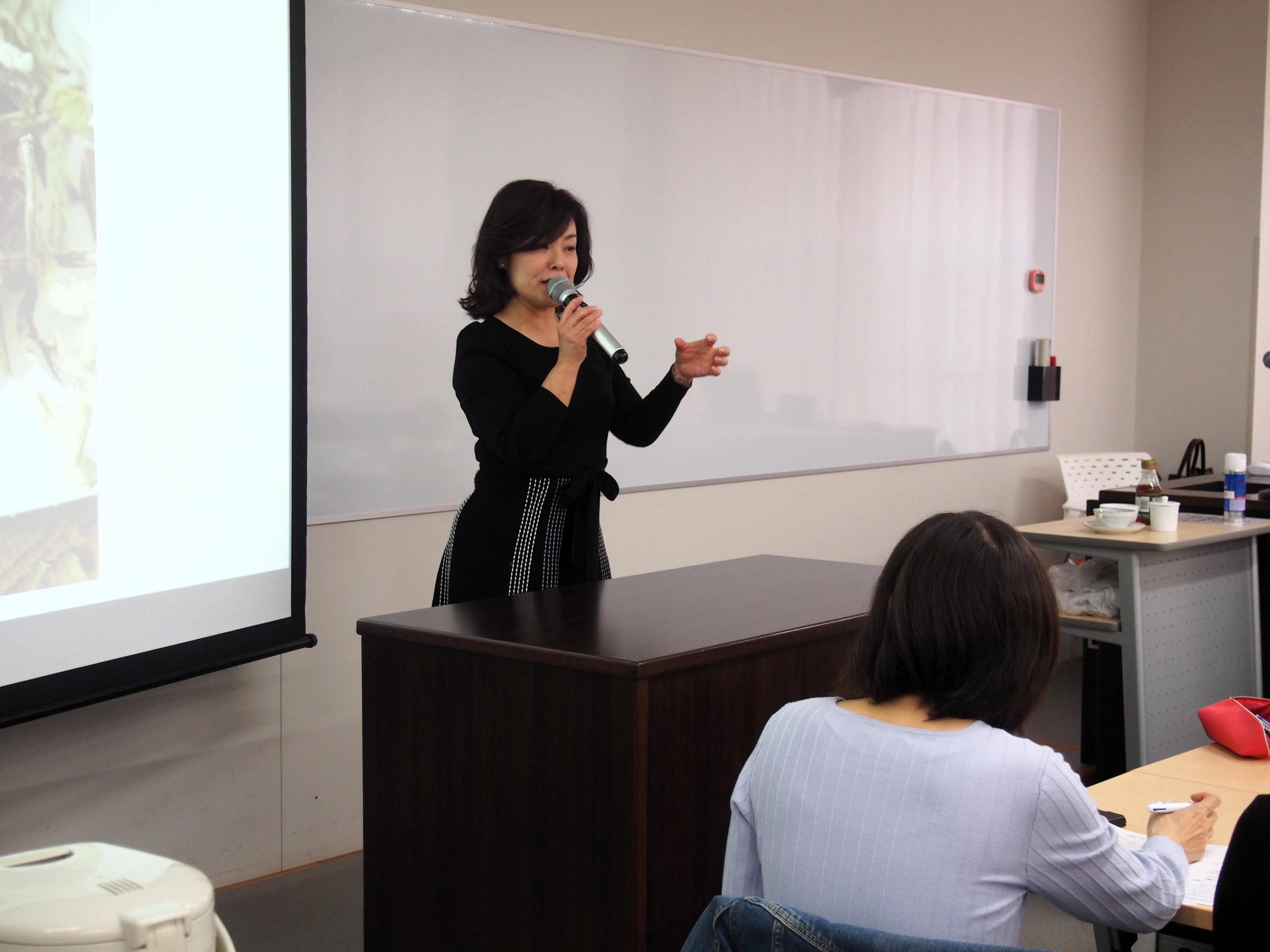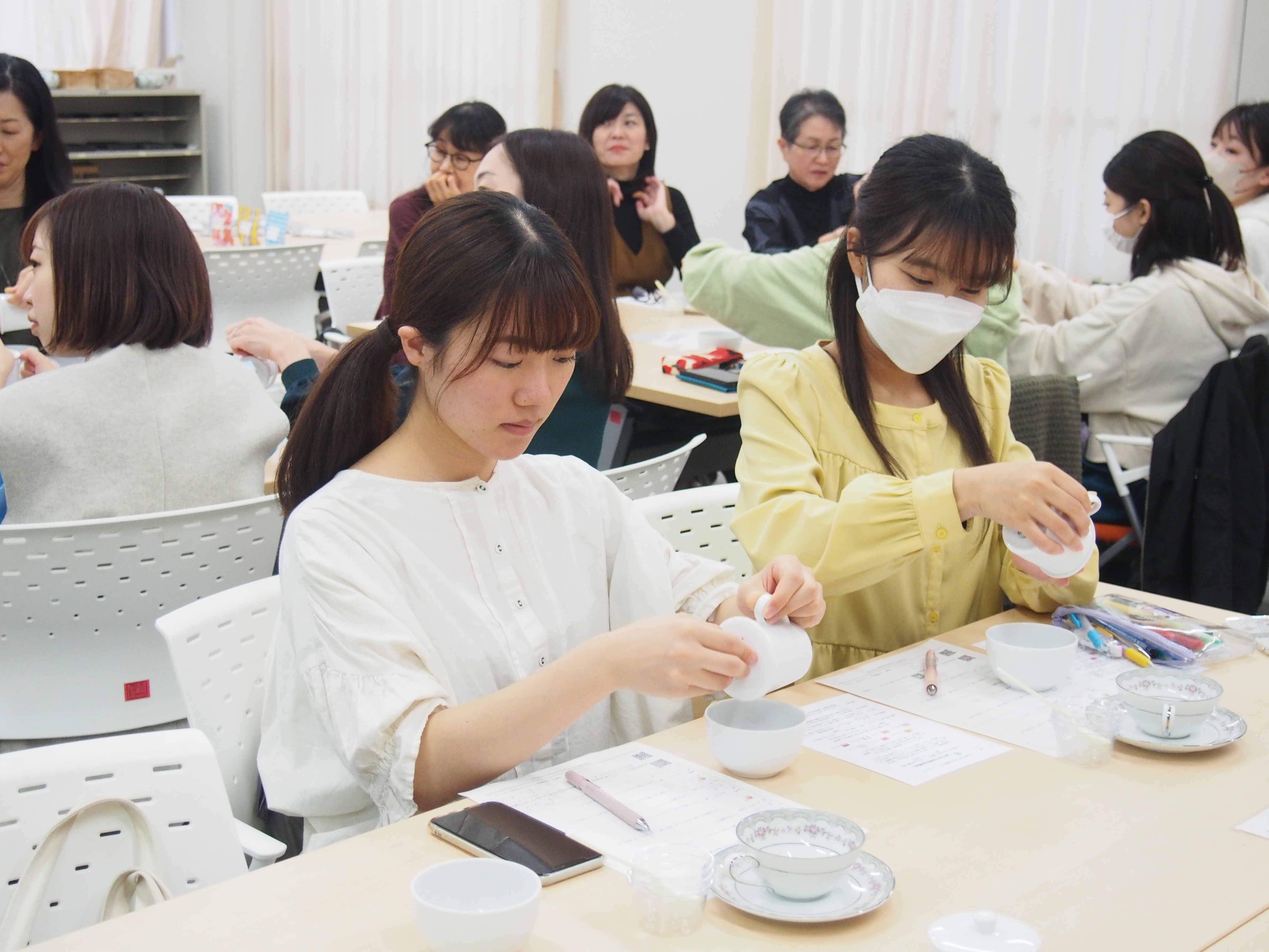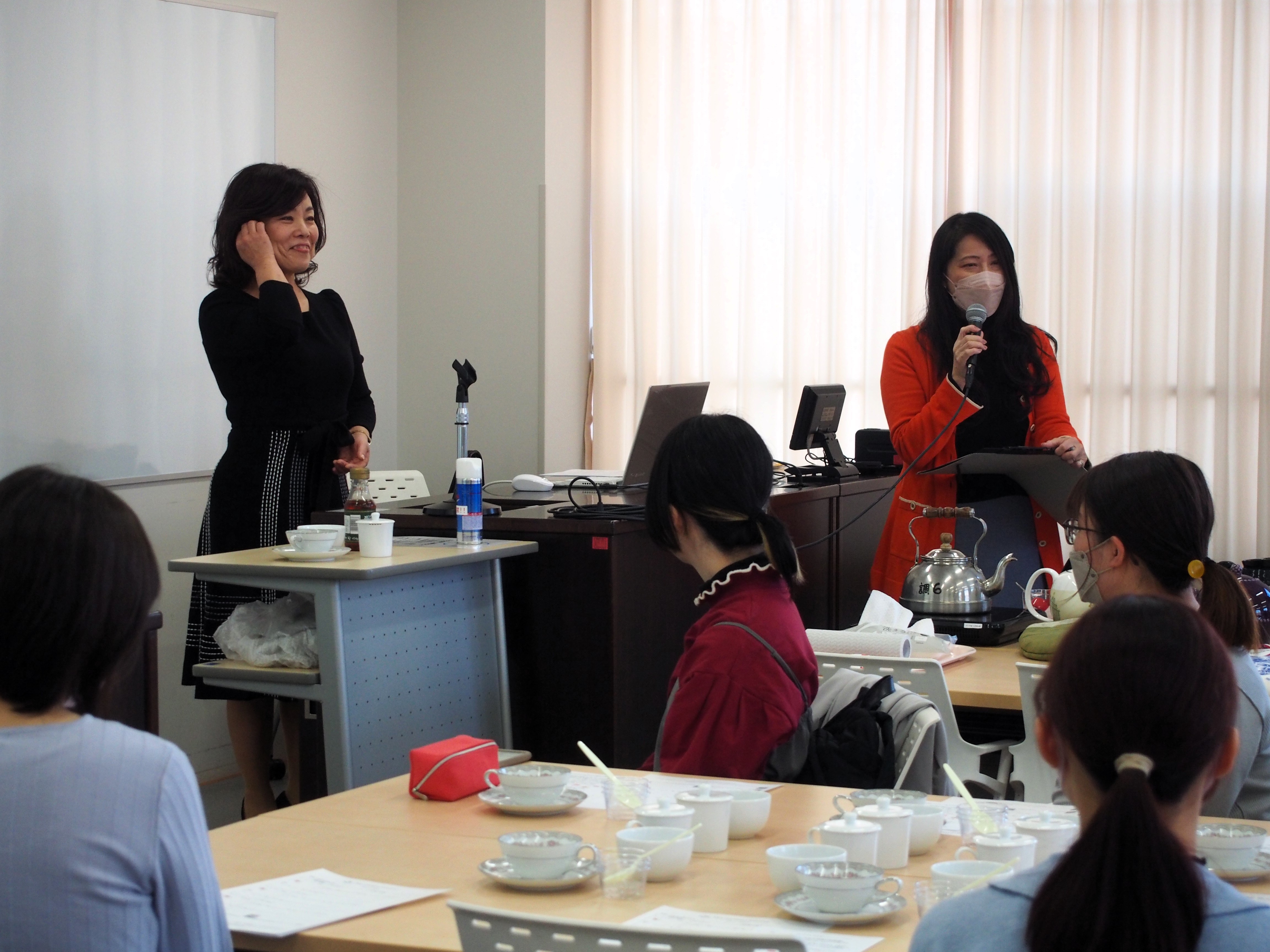 紅茶についての講義から始まり、本場の茶道具を使ったテイスティング、講師の福田万弓先生(TEA GIORNO KYOTO.代表)が淹れてくださった紅茶と先生手作りのクッキーをいただくティータイムなど、非常に盛沢山な内容で、在学生と卒業生の皆さんが一緒になって紅茶を楽しんでいる様子が印象的でした。